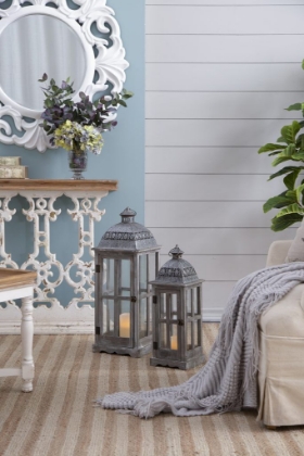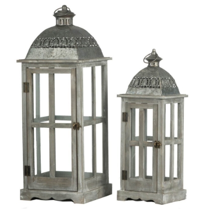 This set of two gray-finished Urban Scape Lanterns offers plenty of options for decor and display. Not only are these lanterns perfect for highlighting decorative candles, they also make lovely terrarium-like homes for miniature potted plants and succulent arrangements. Each one is made from a traditional glass and wood frame with an adorable metal roof.
