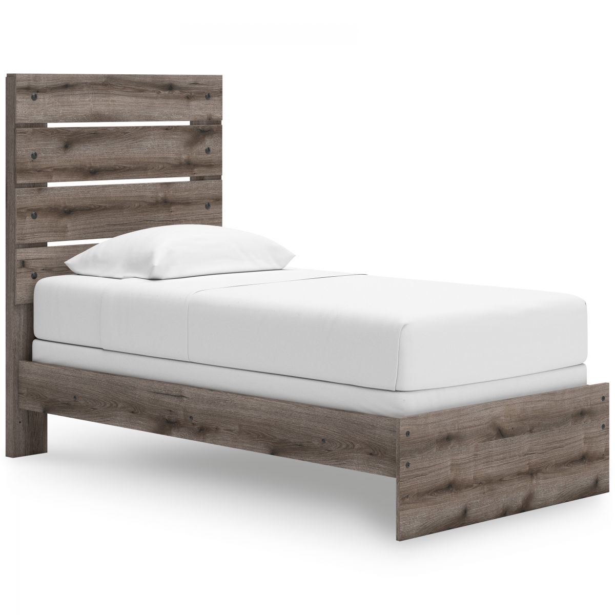 Combining a casual aesthetic with functional flair, this twin panel bed suits styles from rustic to industrial. The headboard's slatted panel design has an easygoing character that's sure to please. Dressed in a chic weathered gray hue, it brings a charmingly curated vibe to bedtime.