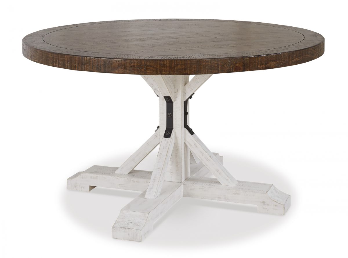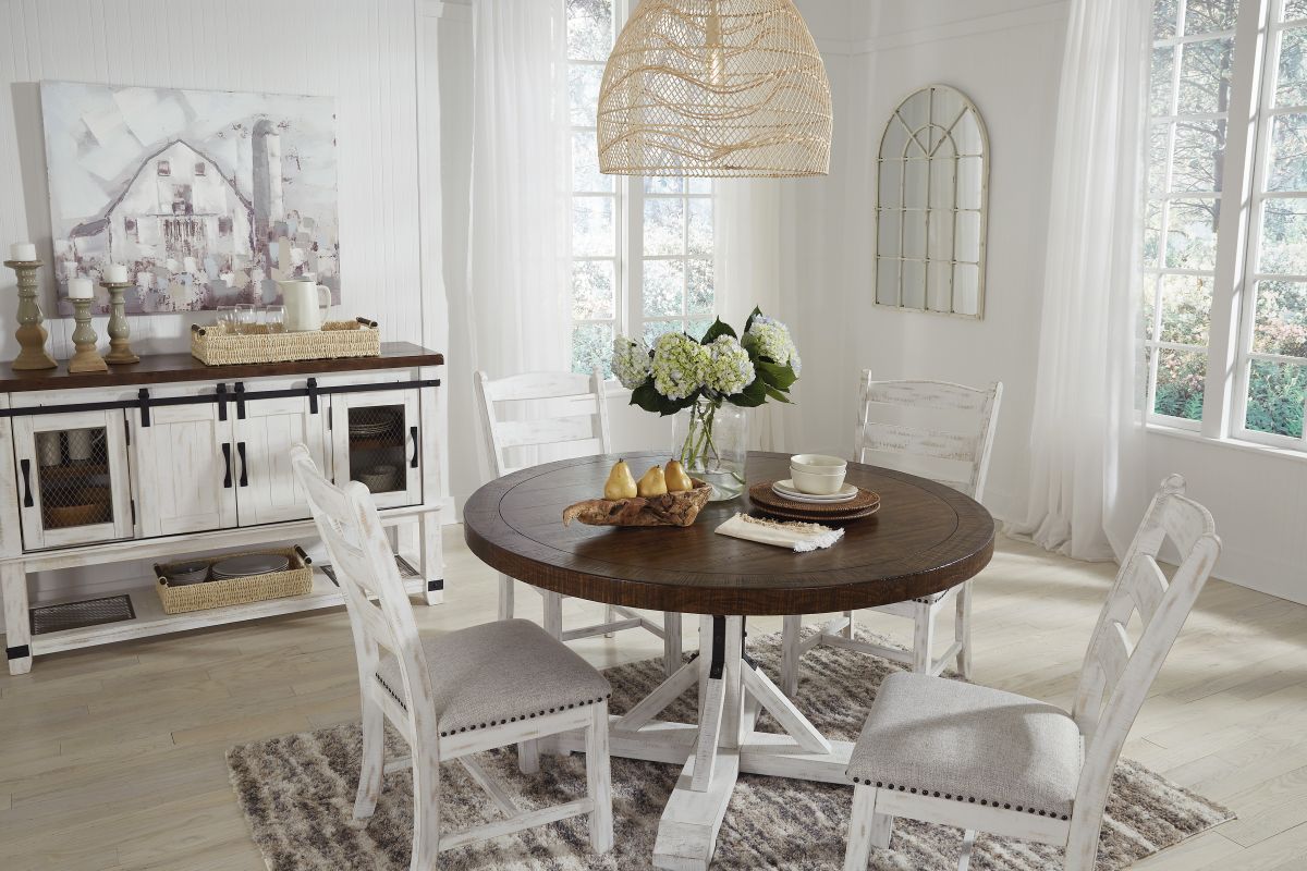 If you love rustic details full of charm and character, the Valebeck dining room table is made with you in mind. Its two-tone distressed finish pairs a rustic brown tabletop with a vintage white base for fresh farmhouse styling. This round table features a sturdy post and bracket base design, with black metal accents and a thick dining top that lends an earthy appeal.
