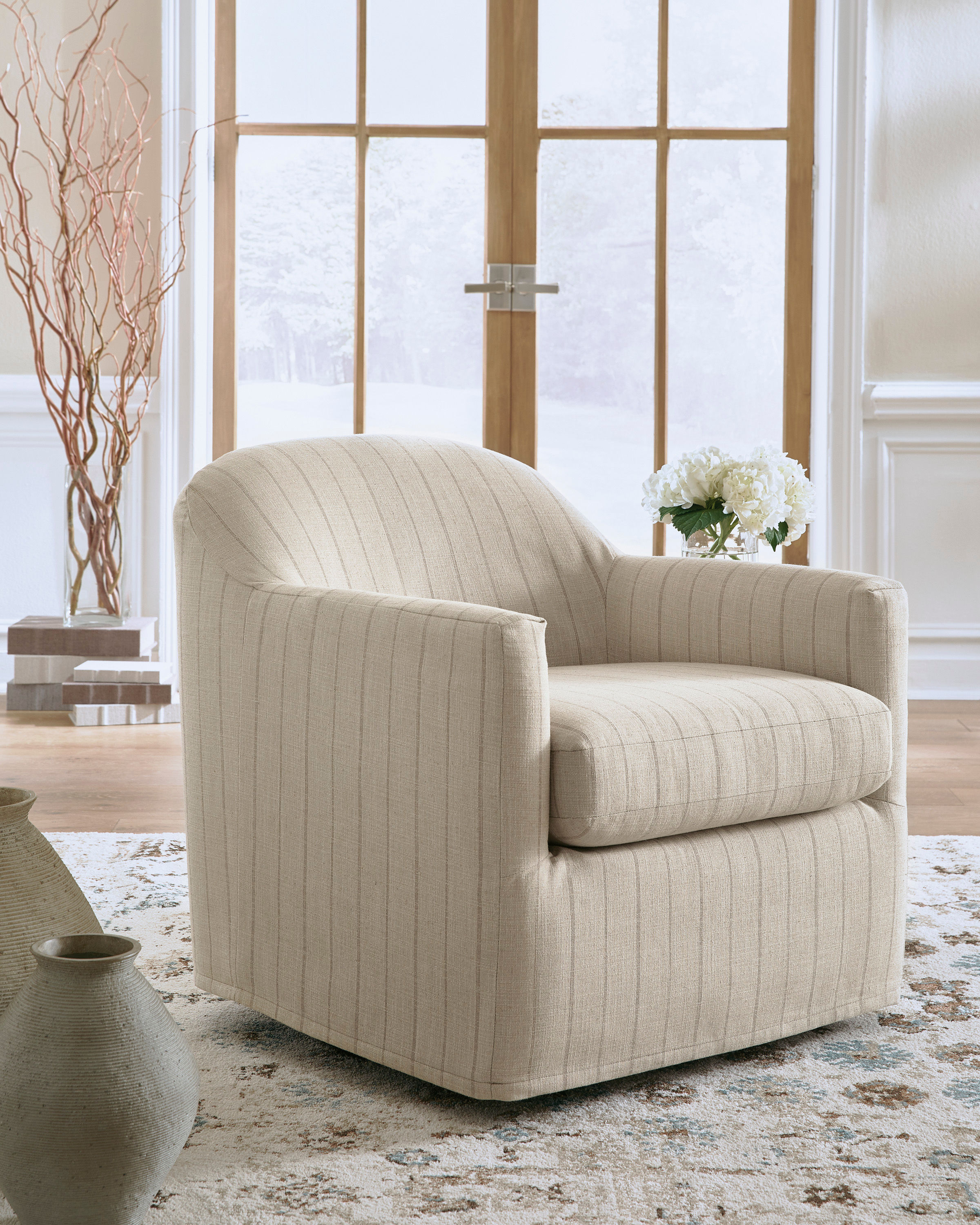 Create a cozy corner that moves with you. This accent chair's smooth 360-degree swivel allows you to effortlessly turn to join the conversation or reach for a nearby drink. With light and breezy striped fabric and a tailored slip cover design, this stylish piece beautifully complements casual decor.