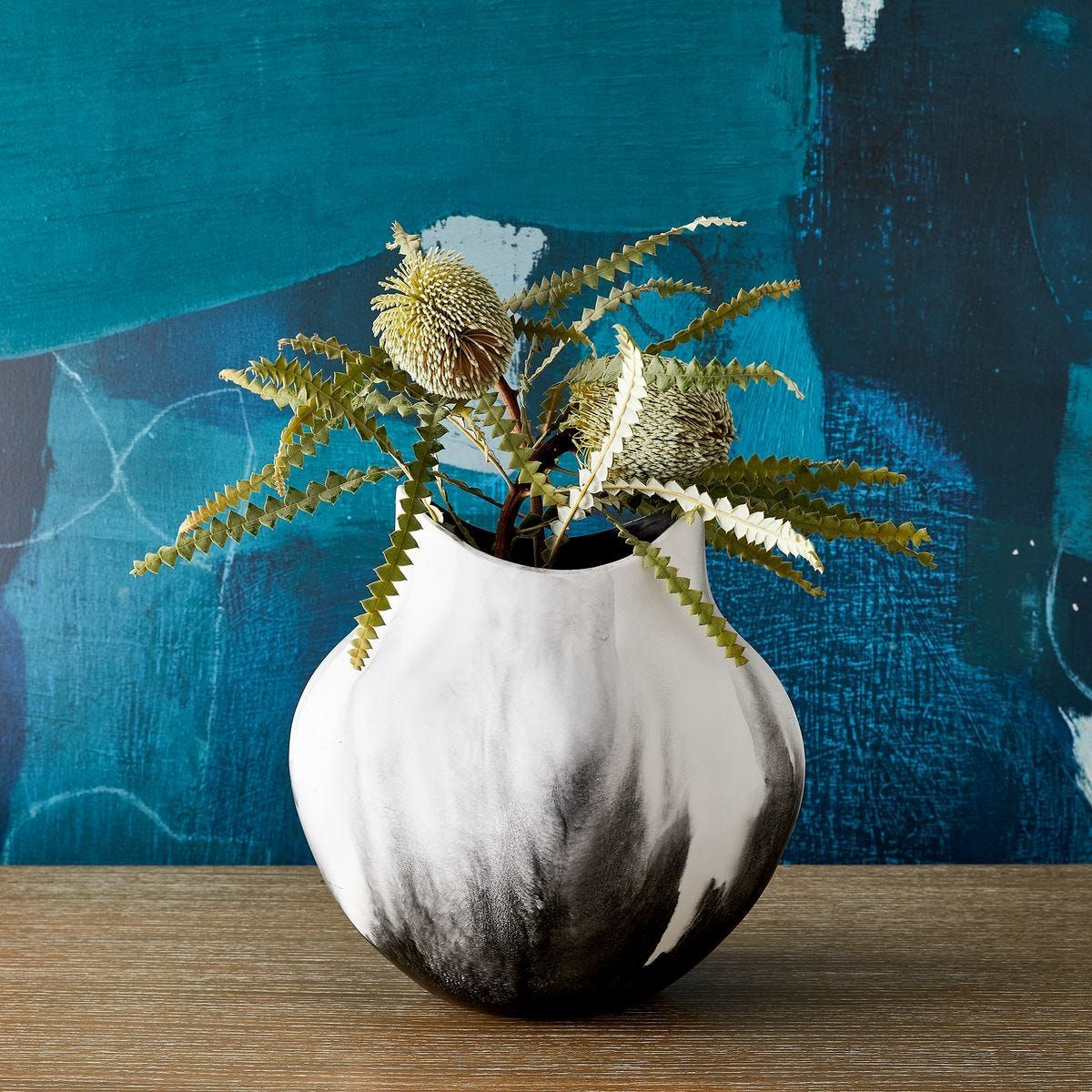 It's right here in black and white: a sculptural functional ceramic vase defined by its high-contrast hand-applied reactive glaze finish. A boisterous interpretation of the classic gourd silhouette, this piece delivers plenty of impact as a standalone display in any room.