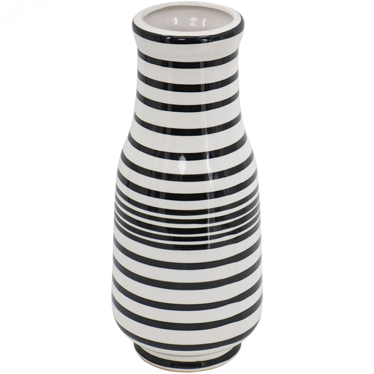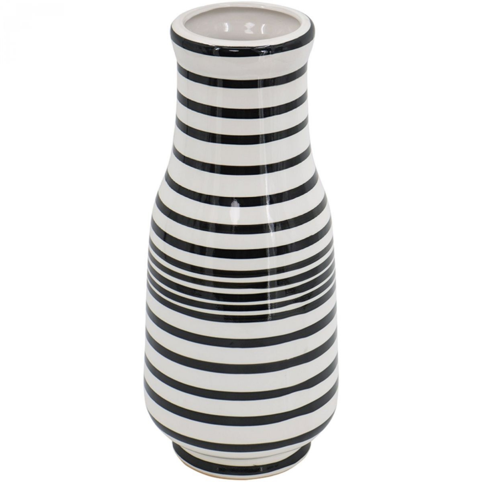 Featuring a curved shape, a circular footed base, an open-mouth design, and a hand-painted series of horizontal black stripes, this decorative vase is crafted from 100% sleek, high-quality ceramic. As versatile as it is charming, this piece could be displayed empty as a decorative accent or filled with a custom arrangement of flowers or branches. This piece is an ideal size for your mantel, dresser, shelves, sideboard, tabletop, or in the corner of any room throughout your home as a floor vase.