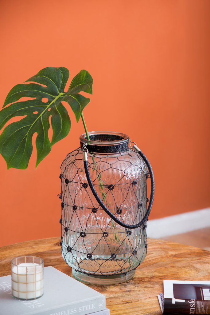 Featuring a clear glass body, a subtle ribbed texture, and black wire netting, this vase will bring a touch of industrial whimsy to any space. Equipped with a braided faux leather handle, this vase can be easily hung or set on a table as desired. The varied textures and understated colorway allow this vase to complement farmhouse, industrial, bohemian, and vintage themes, ensuring it can slot into any setting seamlessly.