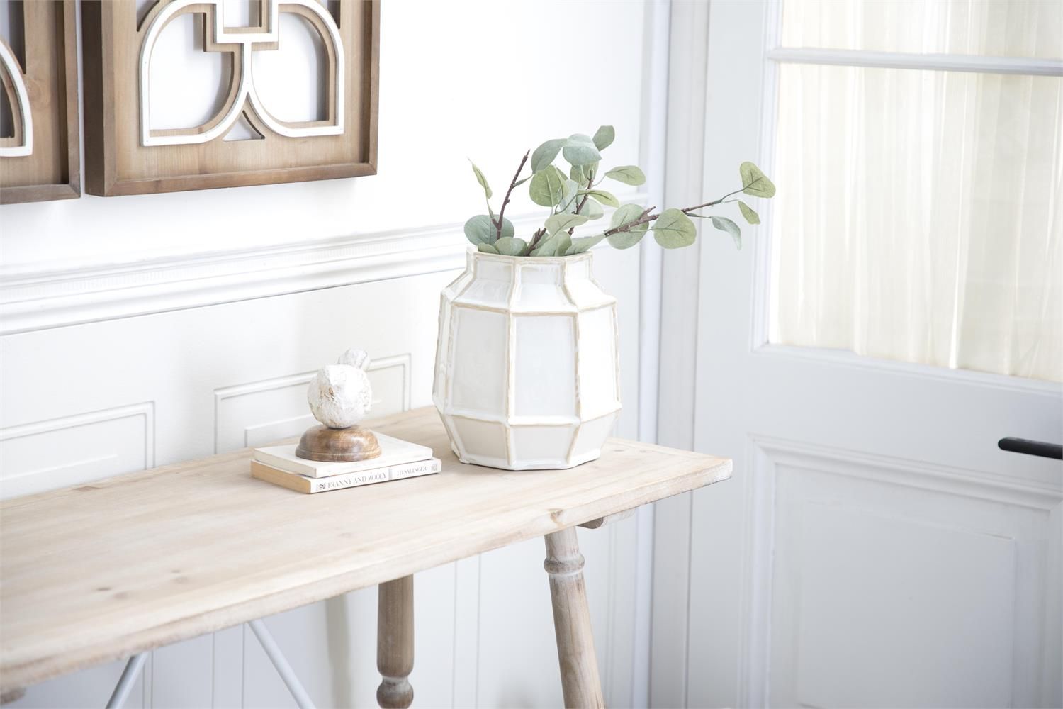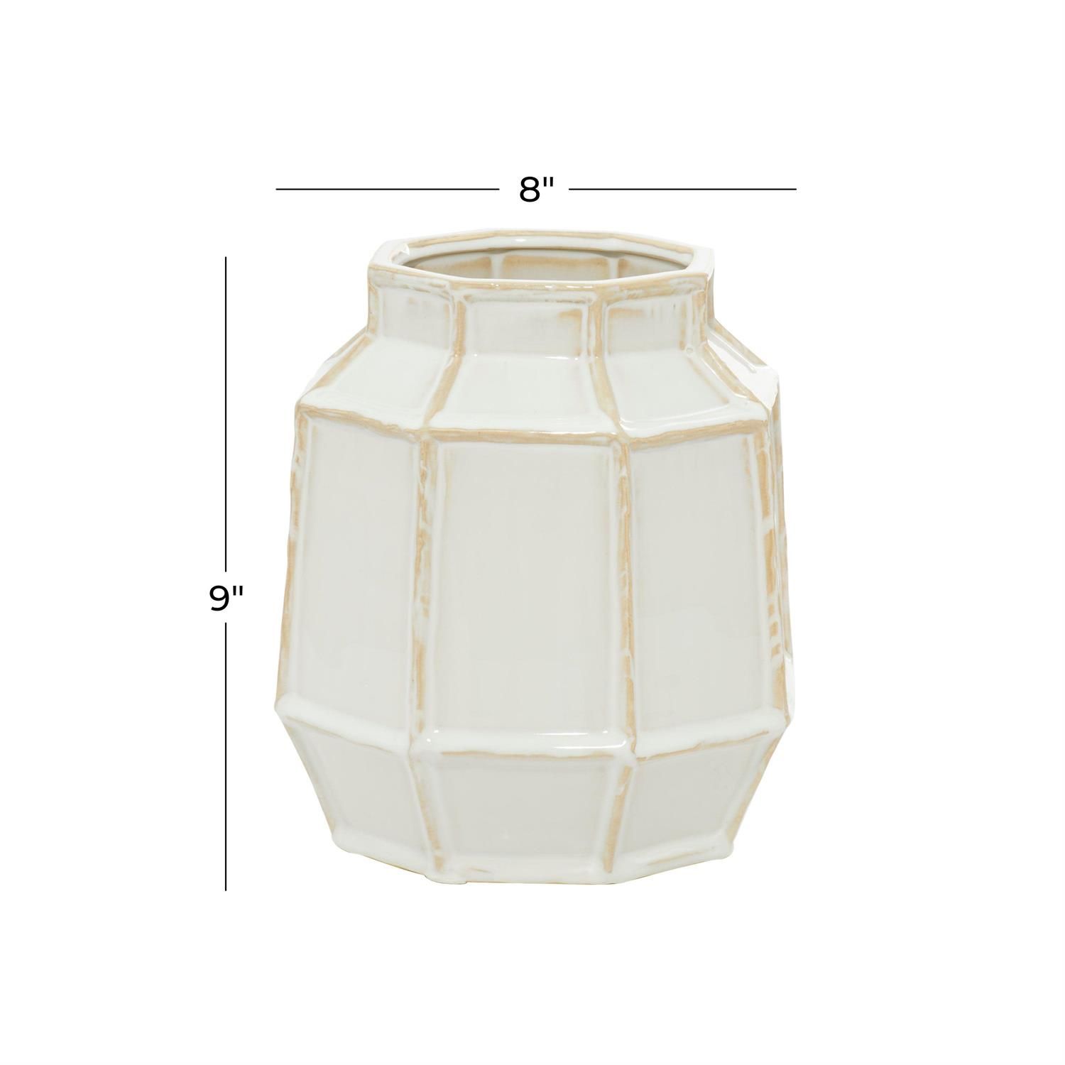 Inspired by sleek elegance and clean lines, a minimalistic design offers effortless luxury with monochromatic tones and bold, angular structures. White decorative vase is made from solid pure ceramic material for a robust structure. Geometric home decor vase adds elegance to any room with its glossy eggshell white finish and its warm beige vertical accents. This stoneware vase features a wide opening and setting, perfect for a centerpiece floral arrangement.