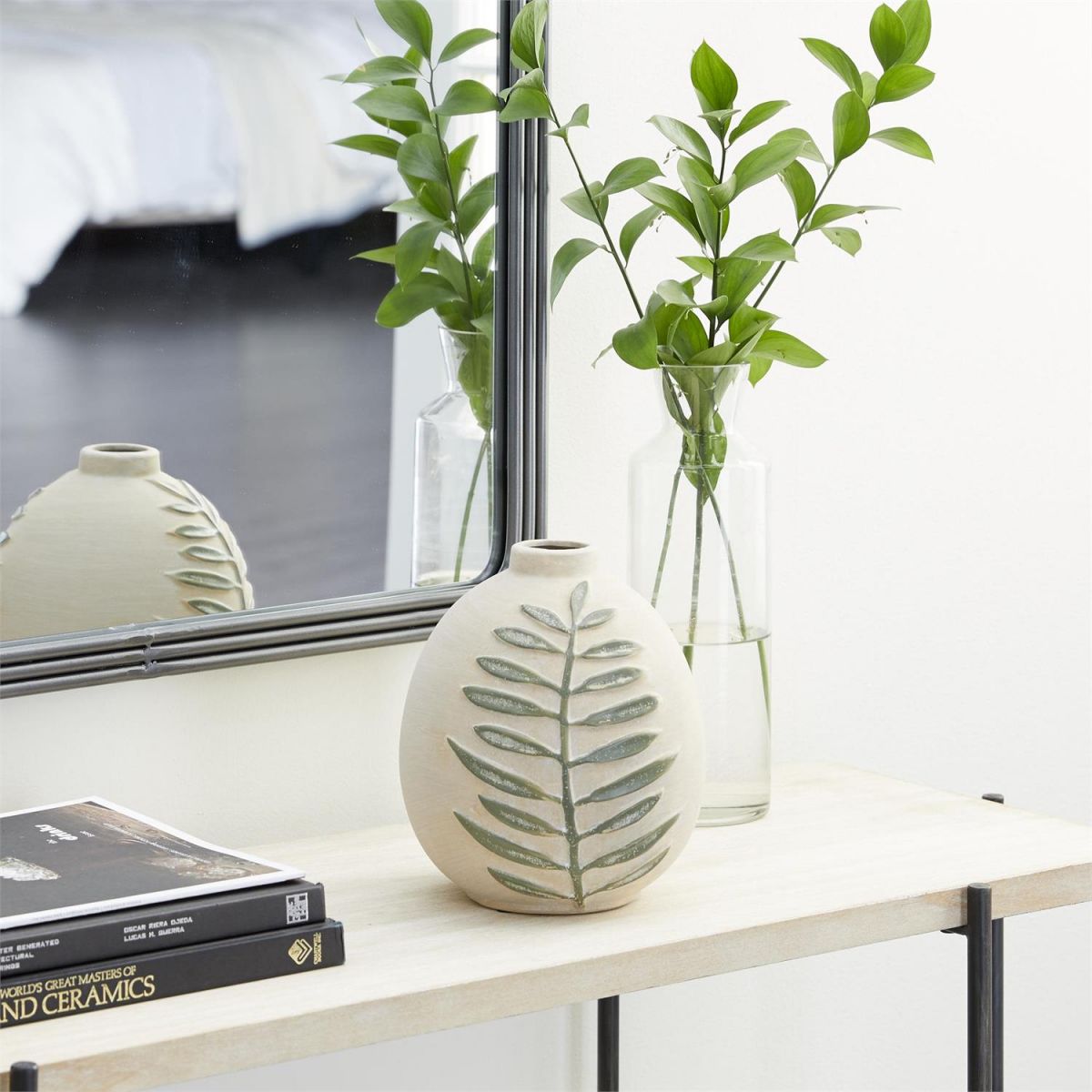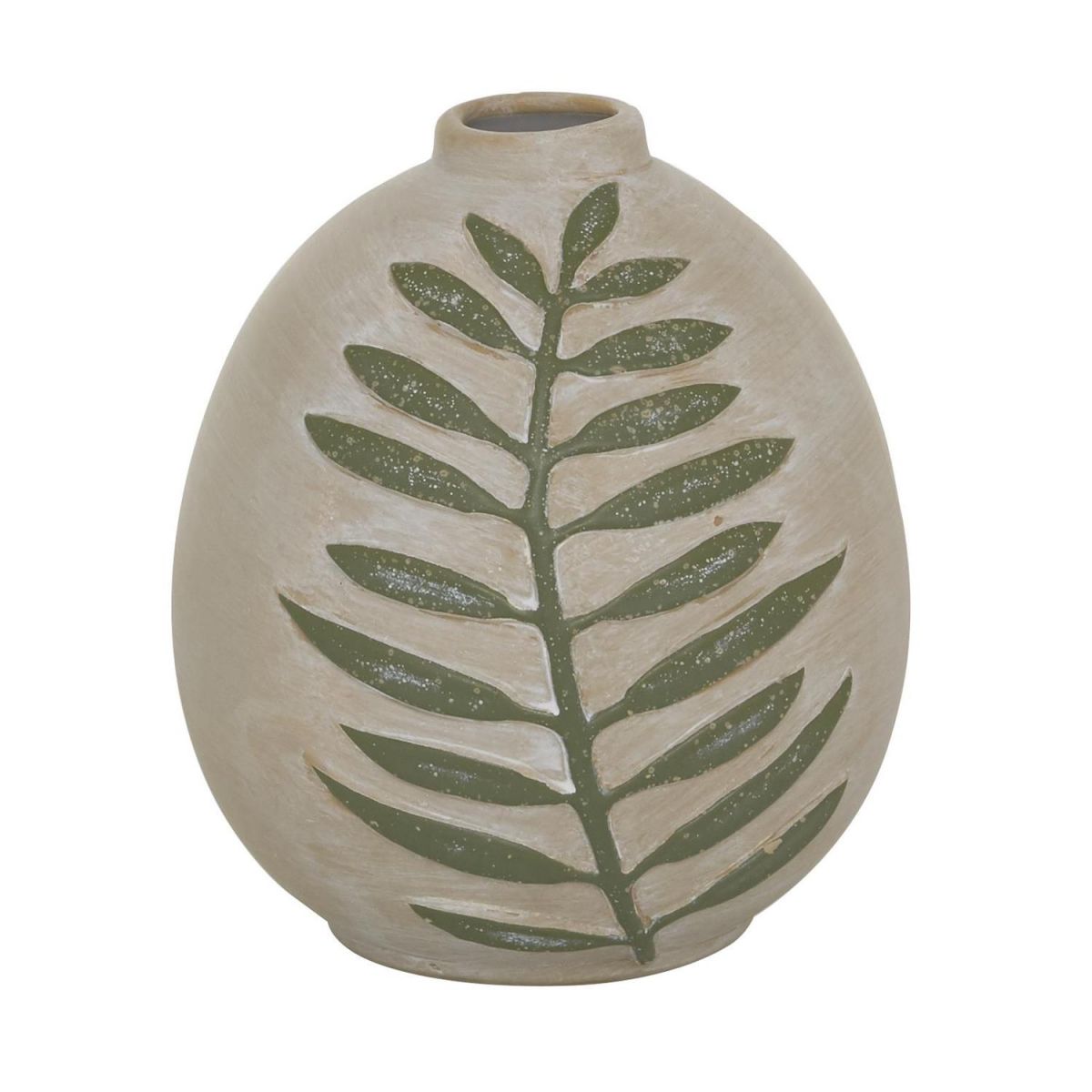 Inspired by blissful serenity and the allure of the sea, where soothing hues and natural textures bring effortless charm to the home. This vase is made of a solid stoneware material for long lasting usage. Matte beige glazed finish with a raised green fern leaf from top to bottom. Matte tan glazed finish with a raised green fern leaf from top to bottom, and a large fern leaf relief sculpture over vase front.'