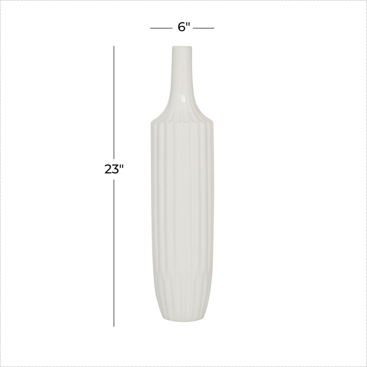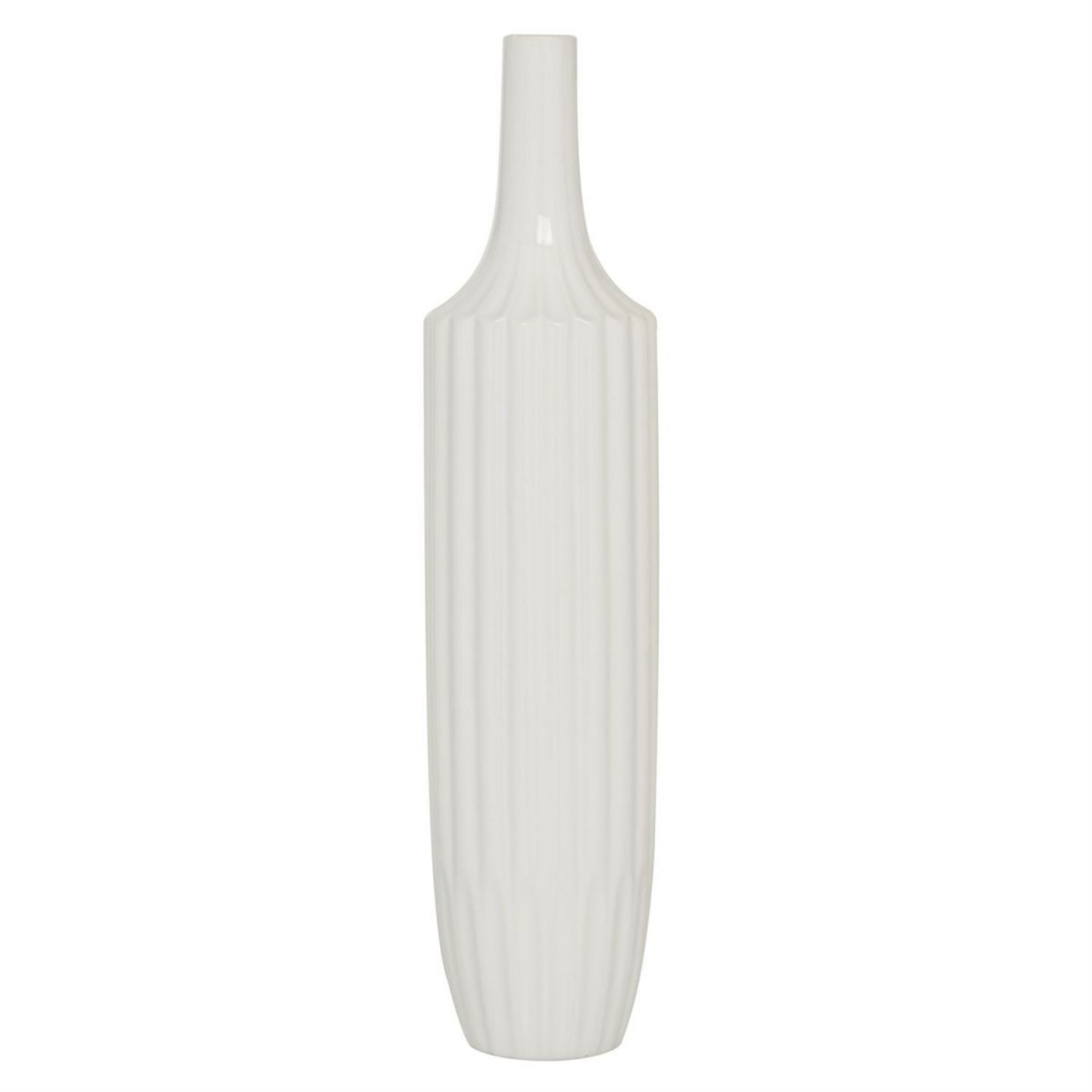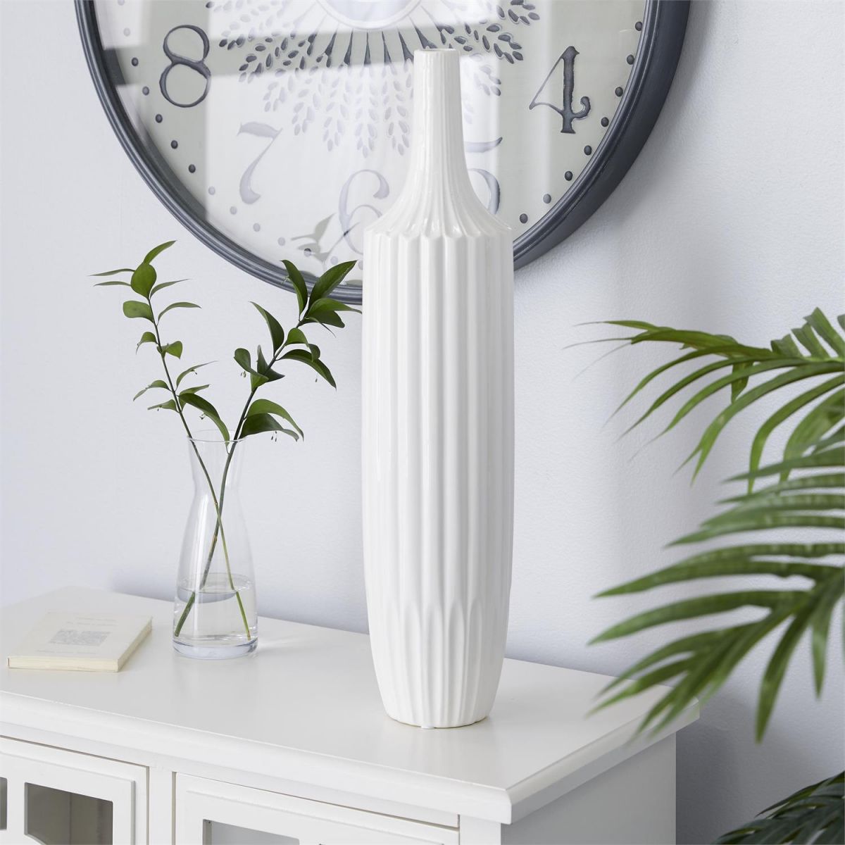 Inspired by sleek elegance and clean lines, a minimalistic design offers effortless luxury with monochromatic tones and bold, angular structures. This white decorative vase is crafted from high-quality ceramic material. The round home decor vase boasts a white color with a polished ceramic finish. This stoneware vase features a unique stripe texture design.