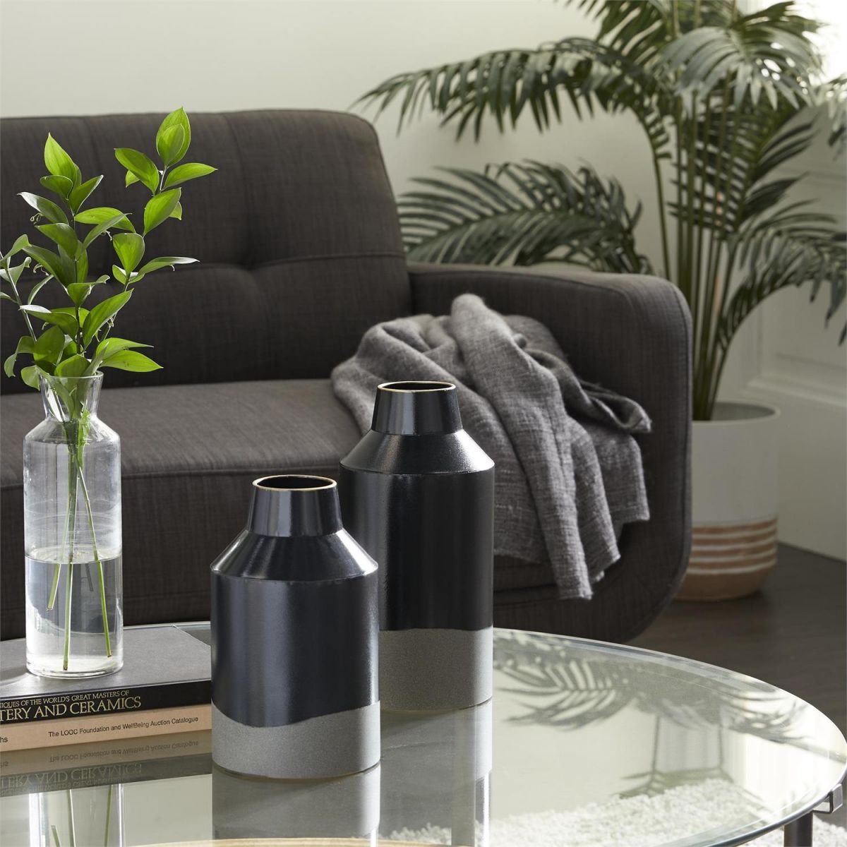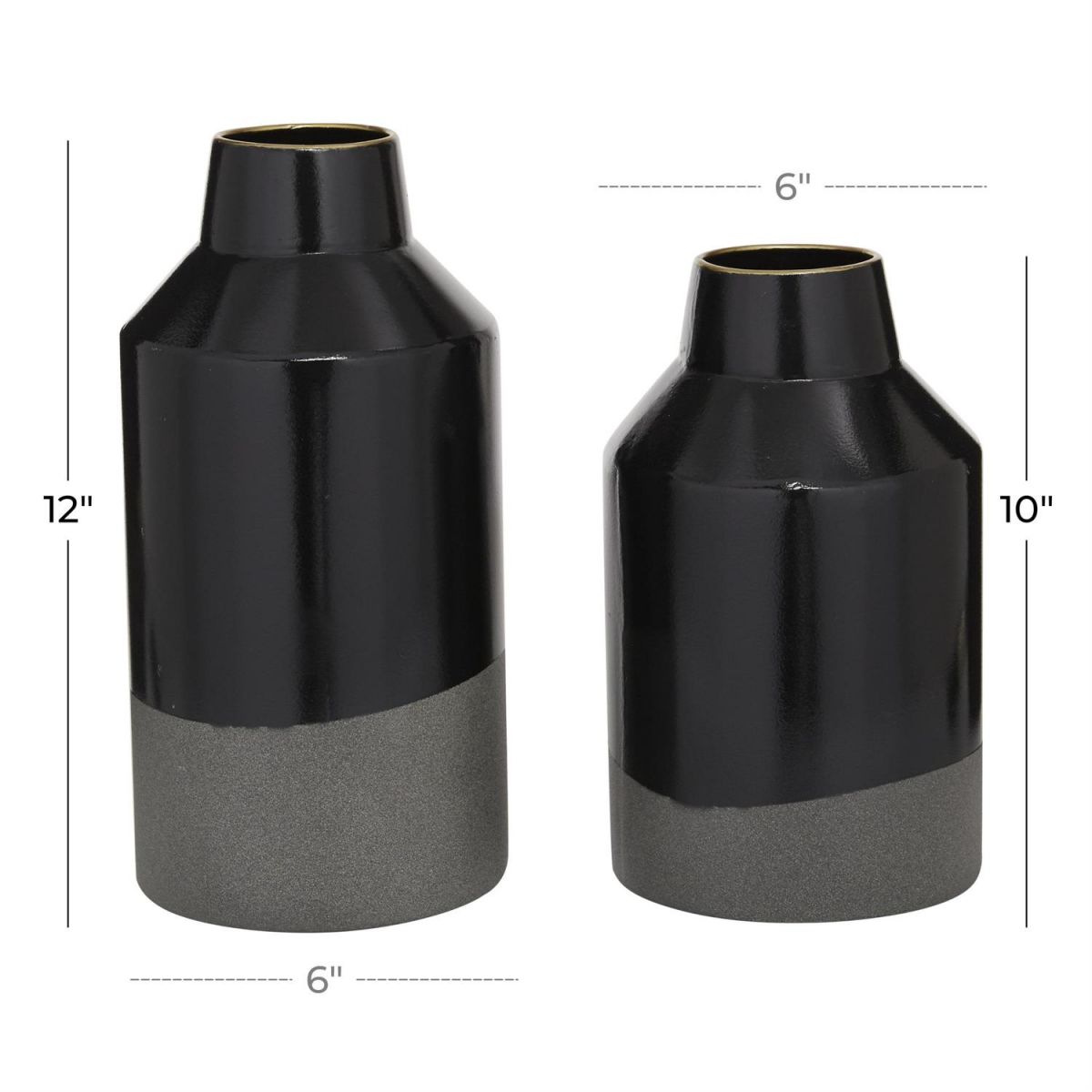Embrace artistic expression with a style that highlights bold designs with sleek lines, neutral elements, and a minimalist aesthetic. Made from durable iron, the black decorative vase set offers both style and longevity. The round home decor vases set features a sleek black color with a polished finish with gray bottom. The iron set of 2 vases includes intricate detailing and elegant craftsmanship, making them perfect for contemporary and sophisticated spaces.