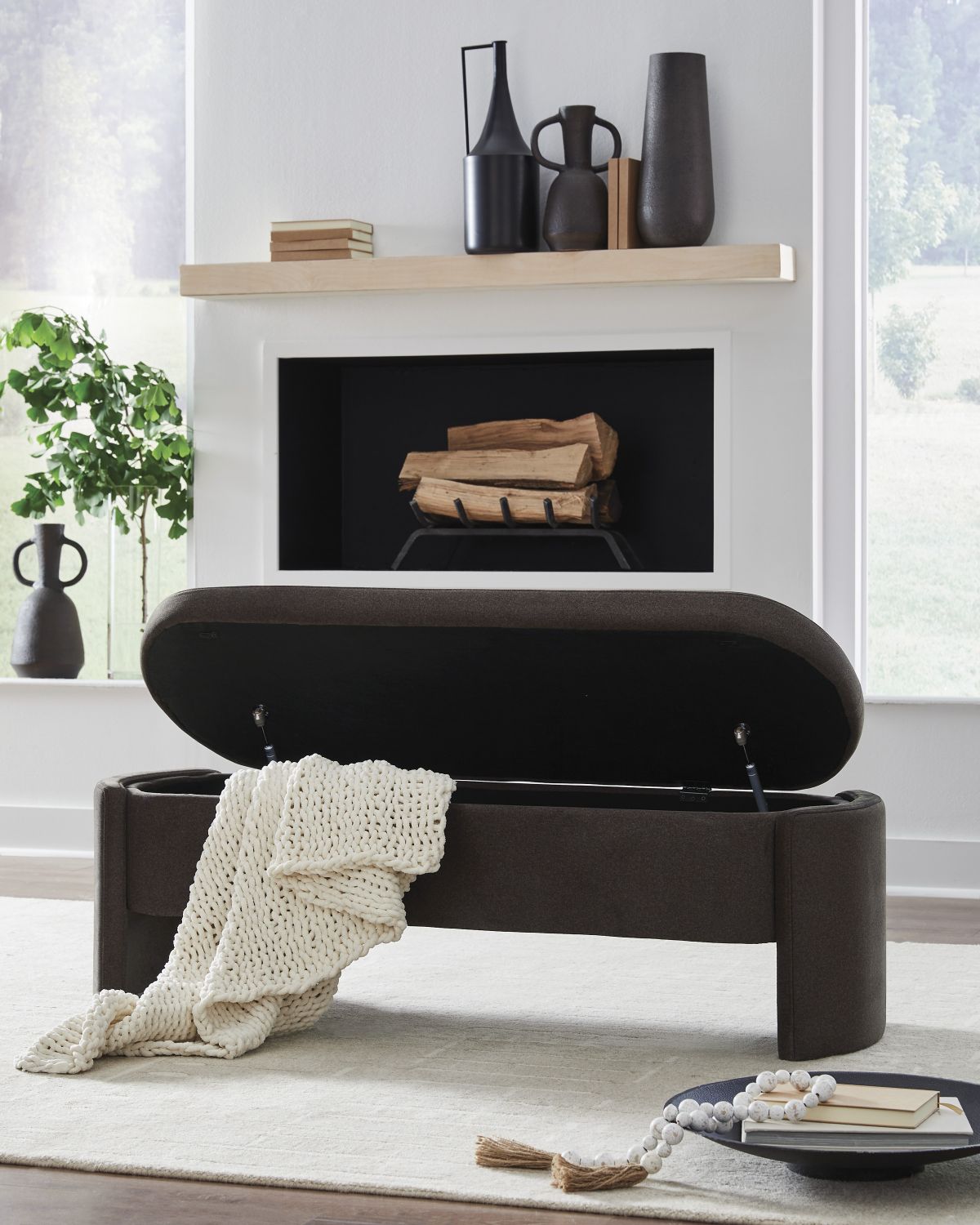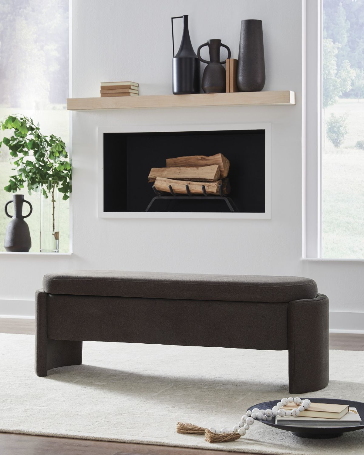 There’s more to this upholstered storage bench than what meets the eye. Its soft heathered brown upholstery provides a comfy sitting area. Lift the hinged seat to reveal lots of storage for pillows, blankets or other essentials. Coupled with its unique capsule shape, this bench is full of form and function.