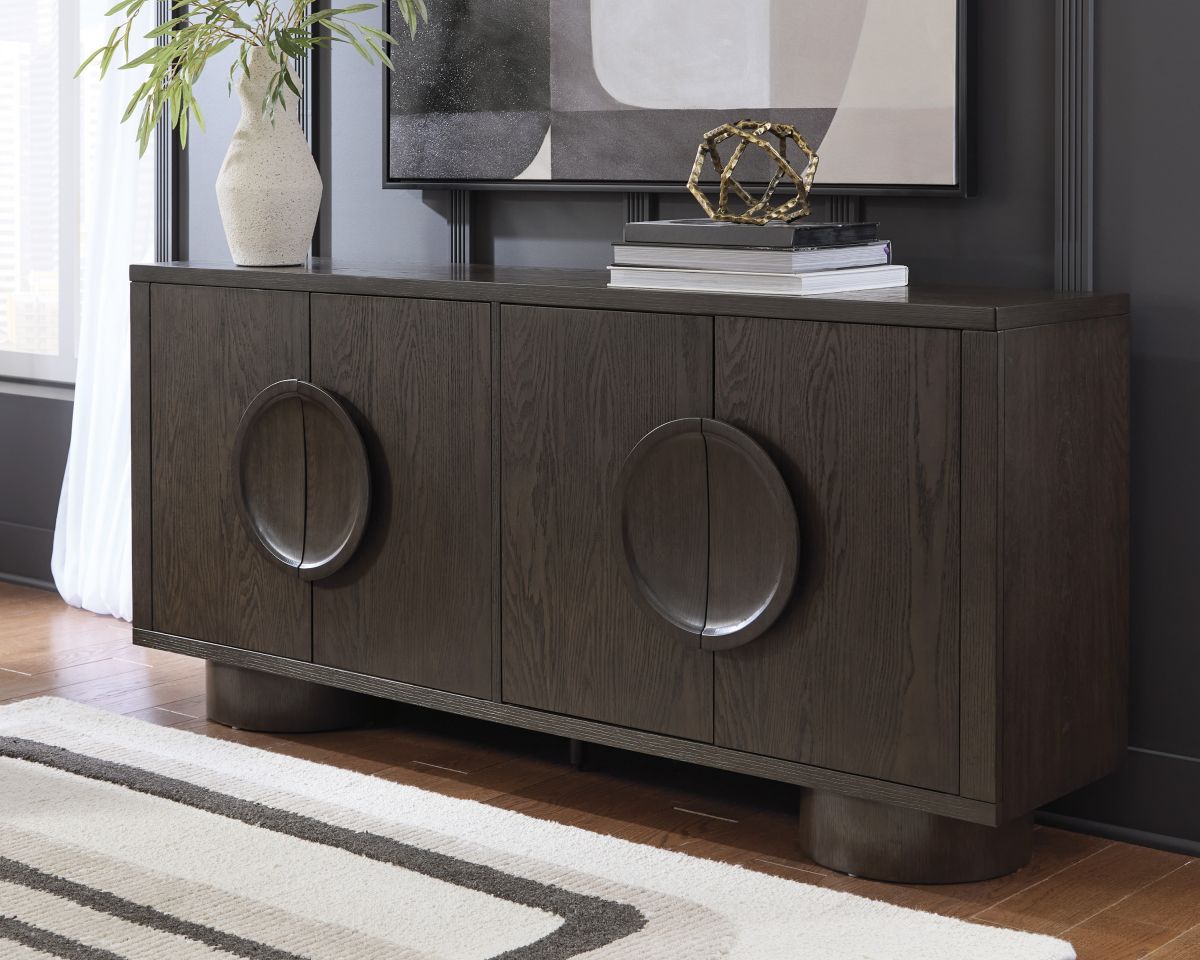 Sleek. Striking. Sculptural. This accent cabinet refines the art of functional fashion. Outfitted in a luxe dark brown finish, it’s an apt addition to contemporary entryways or dining areas. Its distinctive linear profile is beautifully contrasted by the curves of the oversized round legs and circular door pulls. Elevate your entertainment space when you stage this cabinet as a TV stand—openings in the back keep cords and cables organized for a clean, neat look.