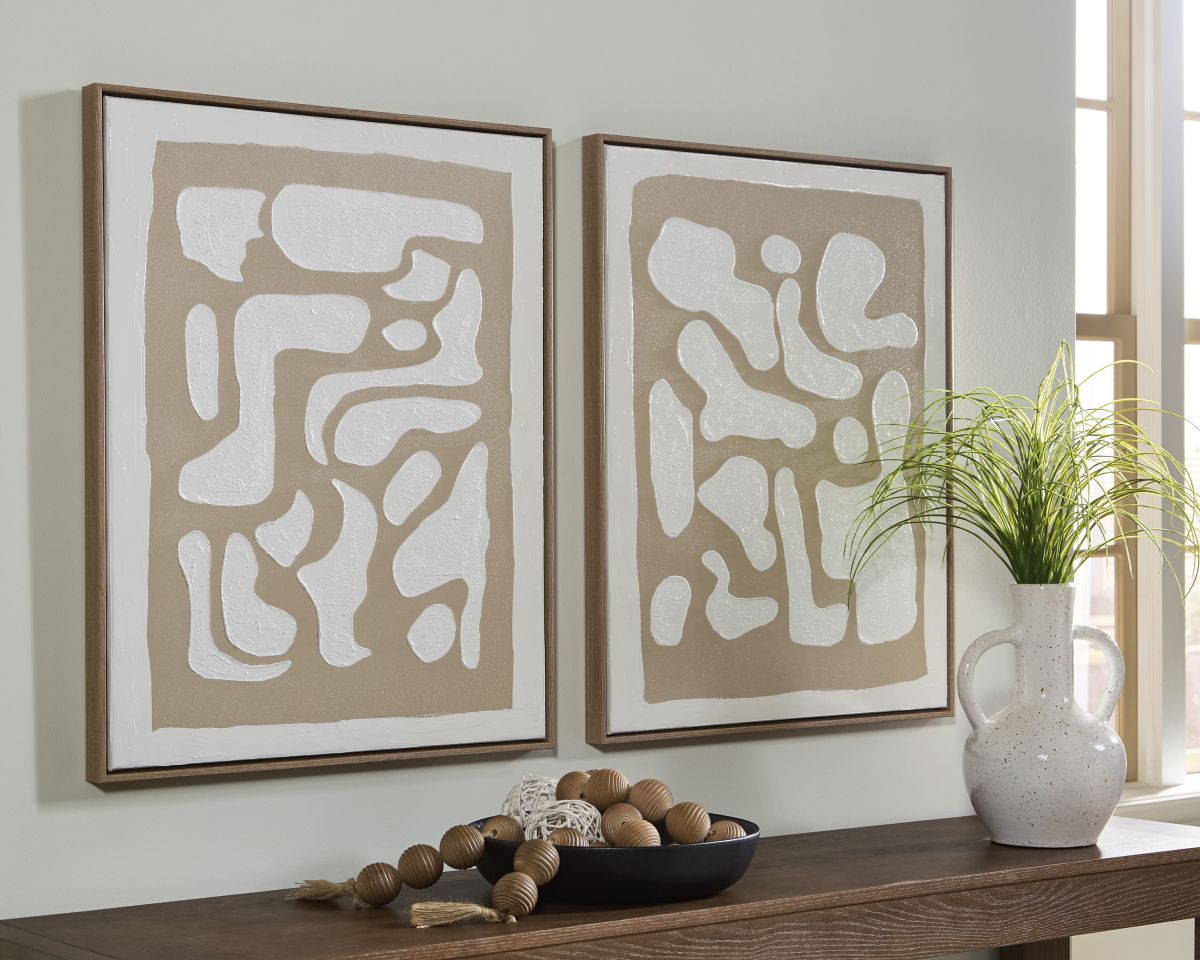 The abstract shapes and neutral hues of this wall art set are a reflection of your modern taste. Hand painting highlights the attention to craftsmanship, with light brown frames elegantly completing the duo. And each piece hangs four ways, giving you the flexibility to switch up their staging.