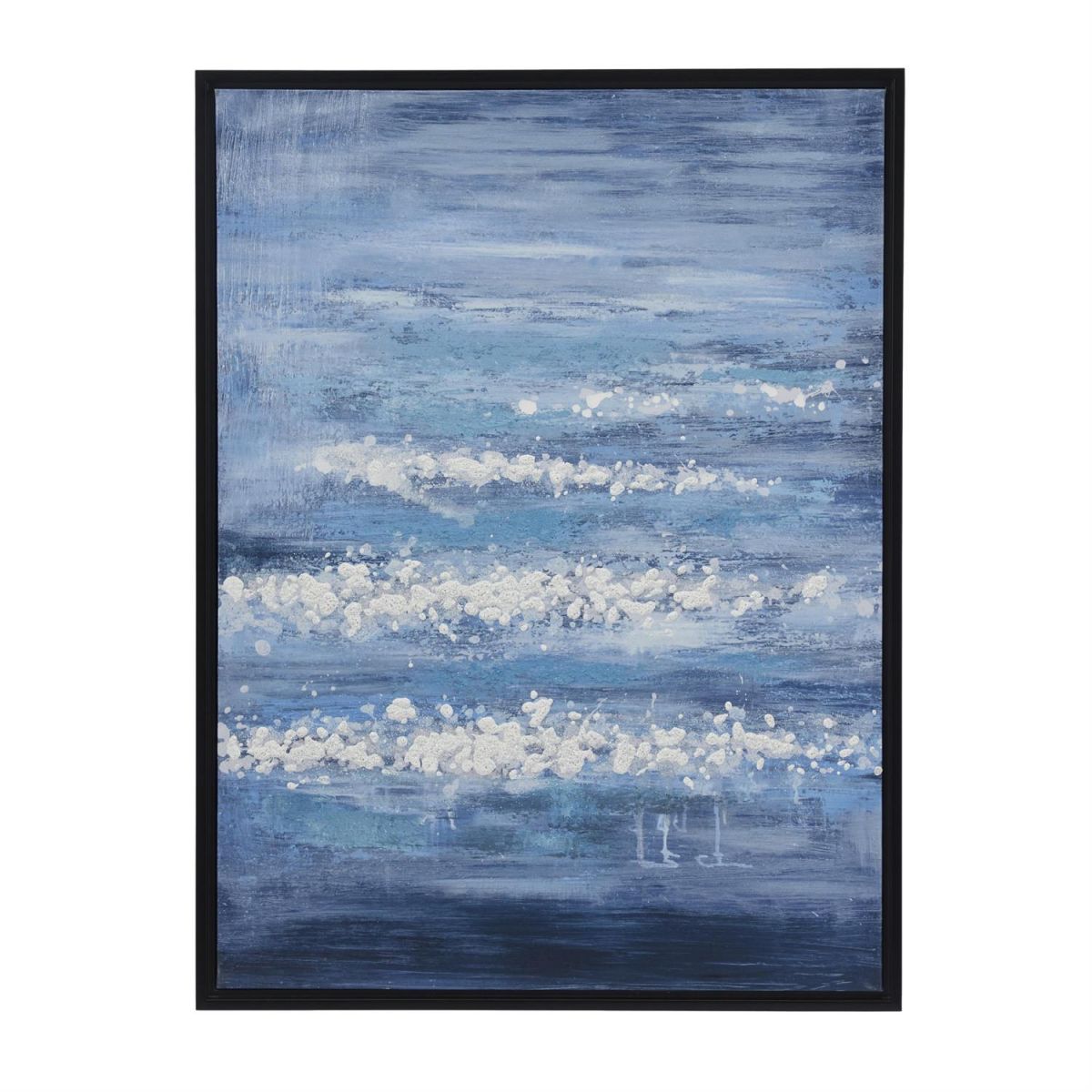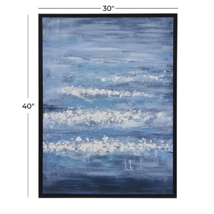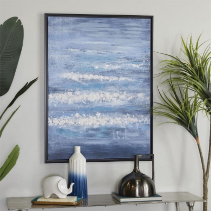 Inspired by sleek elegance and clean lines, a minimalistic design offers effortless luxury with monochromatic tones and bold, angular structures. The blue living room framed wall art is crafted with iron, polystone, fir wood, and canvas materials. This rectangle decorative framed wall art highlights blue and white colors in a textured finish, encased within a black frame. The canvas framed wall art features an abstract design with blue and white colors and textured finish, adding a serene touch to any room.