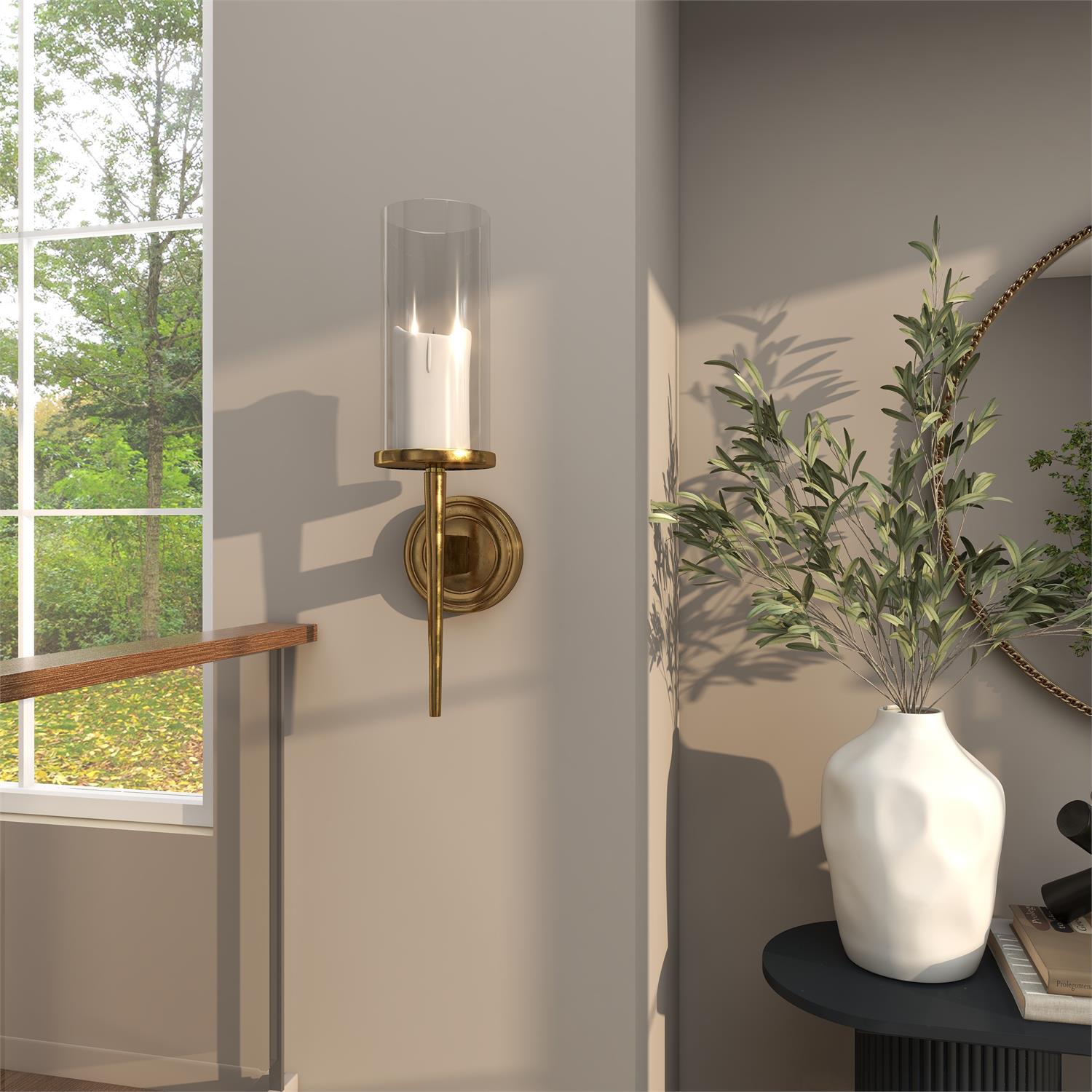 Inspired by sleek elegance and clean lines, a minimalistic design offers effortless luxury with monochromatic tones and bold, angular structures. The gold indoor outdoor wall sconce is crafted from sturdy aluminum and glass, ensuring both durability and style. This round glass wall candle holder features a polished gold finish with a clear glass holder, adding a modern touch to any decor. The aluminum wall sconce showcases a tall glass holder with a pointed tail and a round wall mount for unique elegance.