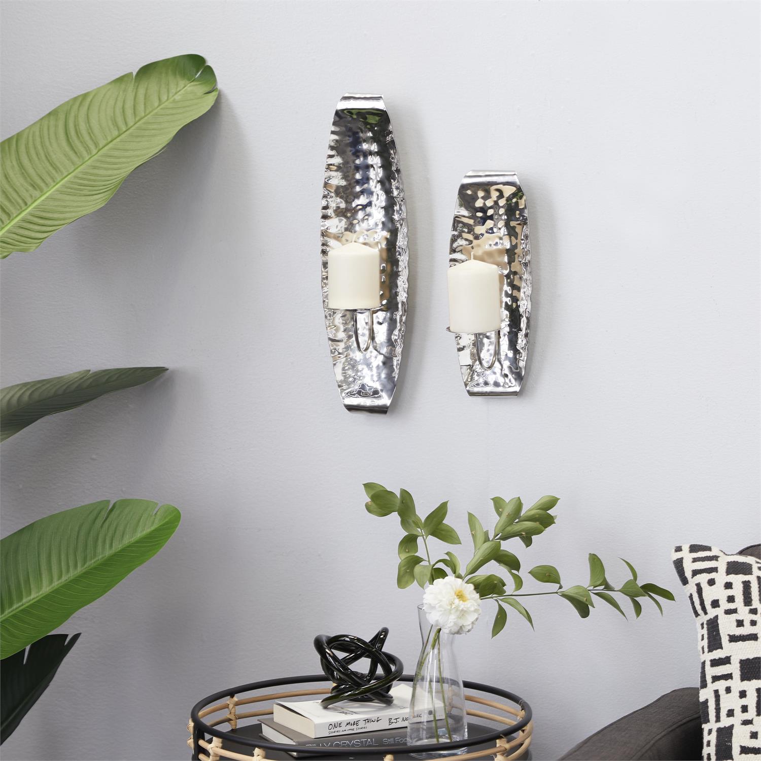 Embrace artistic expression with a style that highlights bold designs with sleek lines, neutral elements, and a minimalist aesthetic. Decorative candle wall sconces are constructed of robust, lasting, and shiny stainless steel. Beautiful candle holder wall sconces features polished silver with hammered style. Stunning wall sconces have round platforms with spikes that keep candles in place.