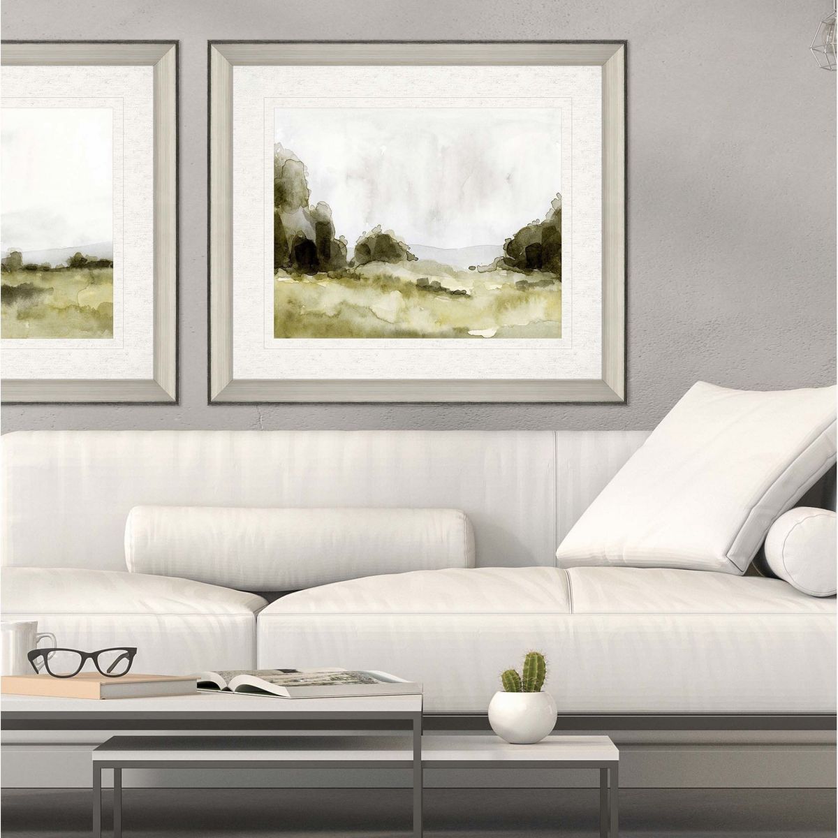 An impressionistic green landscape features premium linen-look ivory matting. Framed in a modern silver finish moulding with black accents.