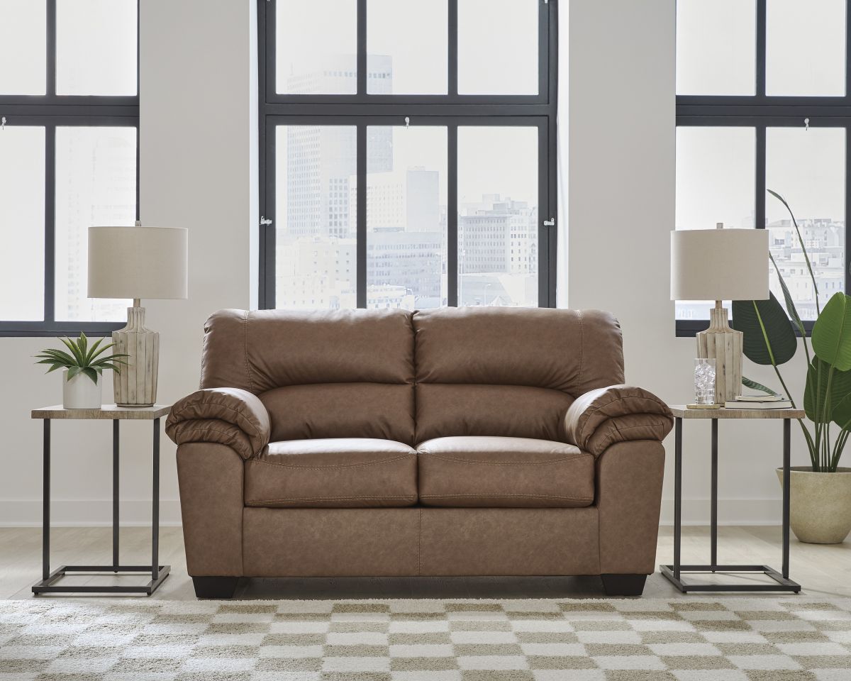 Modern comfort never looked so good. Sporting supremely soft yet durable cushions accented with high-fashion jumbo stitching, this stunning loveseat is the ultimate choice in comfortably cool, contemporary style. Its caramel-hued faux leather indulges with an upscale feel and wows like the real thing.
