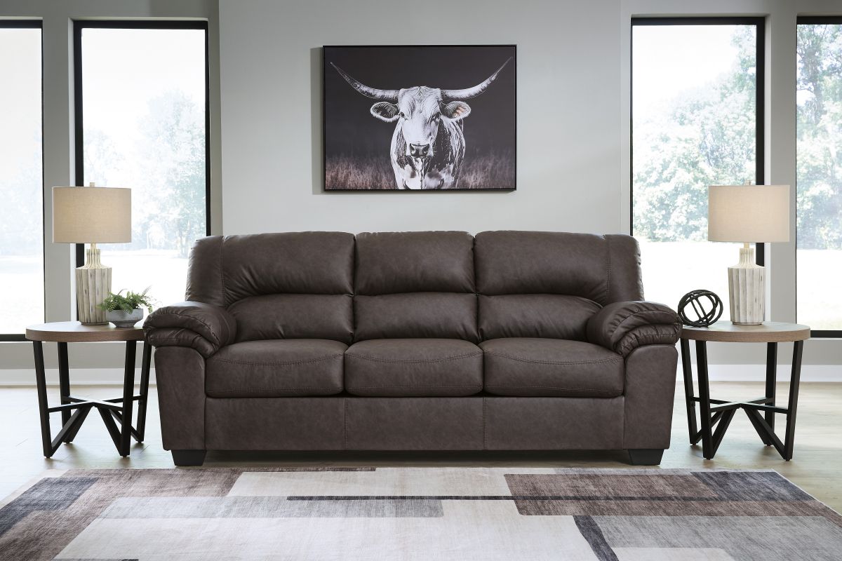 Modern comfort never looked so good. Sporting supremely soft yet durable cushions accented with high-fashion jumbo stitching, this stunning sofa is the ultimate choice in comfortably cool, contemporary style. Its umber-hued faux leather indulges with an upscale feel and wows like the real thing.