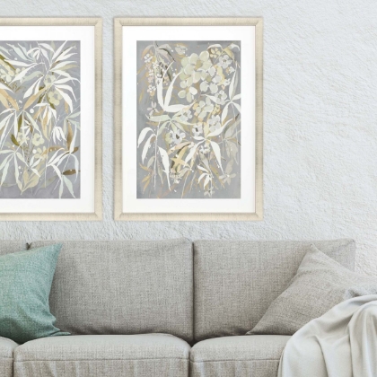 Airy botanicals are matted in white and framed in a champagne gold block contemporary moulding.
