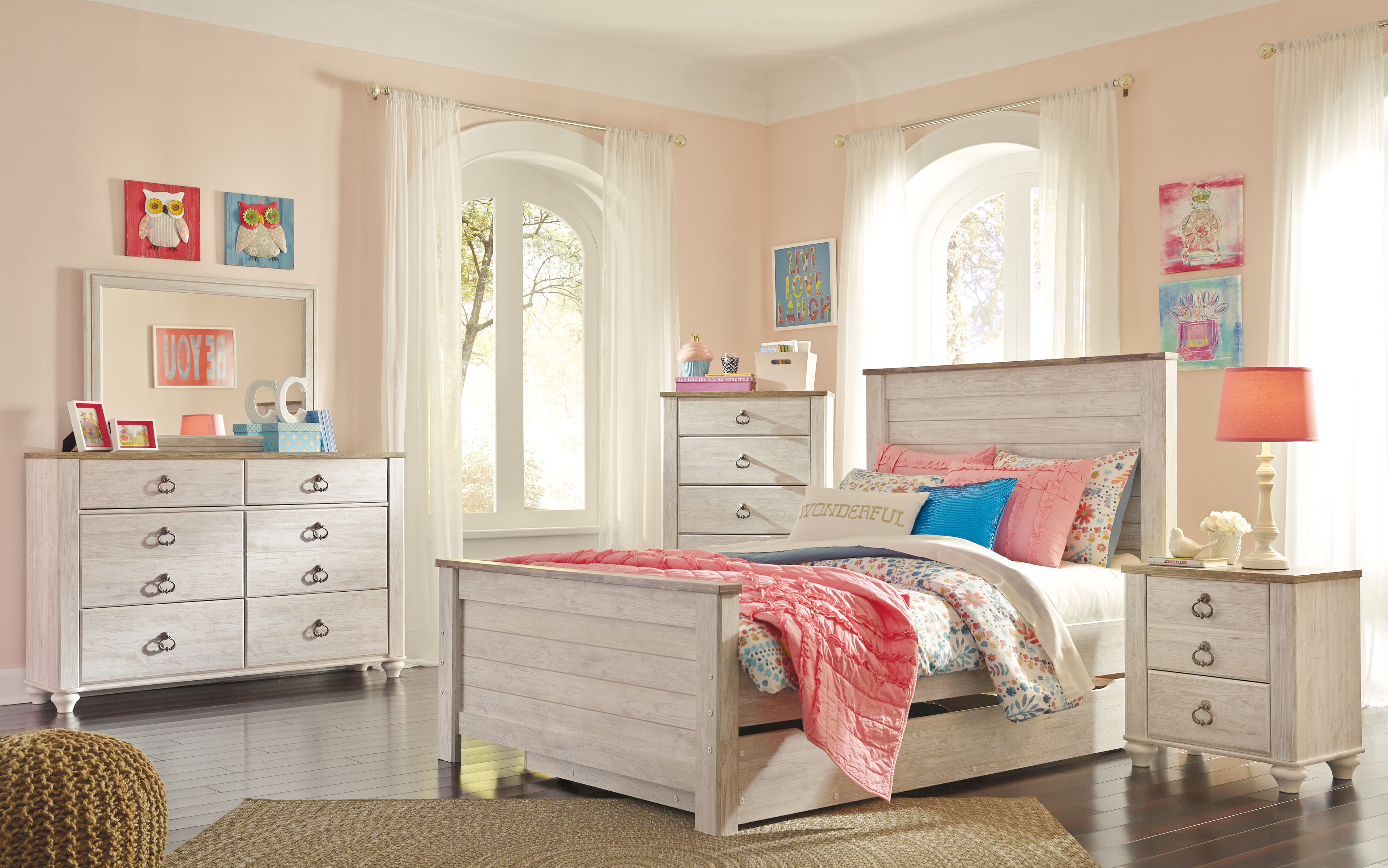 The Willowton full panel bed with storage is the ultimate statement piece for a coastal cottage or shabby chic inspired retreat. Whitewashed finish is wonderfully easy on the eyes. Faux plank tops on the headboard and footboard infuse a driftwoody look that has our minds drifting away to beachy-keen escapes. Pair of smooth-gliding drawers keeps linens, blankets and jammies close at hand. Mattress sold separately.