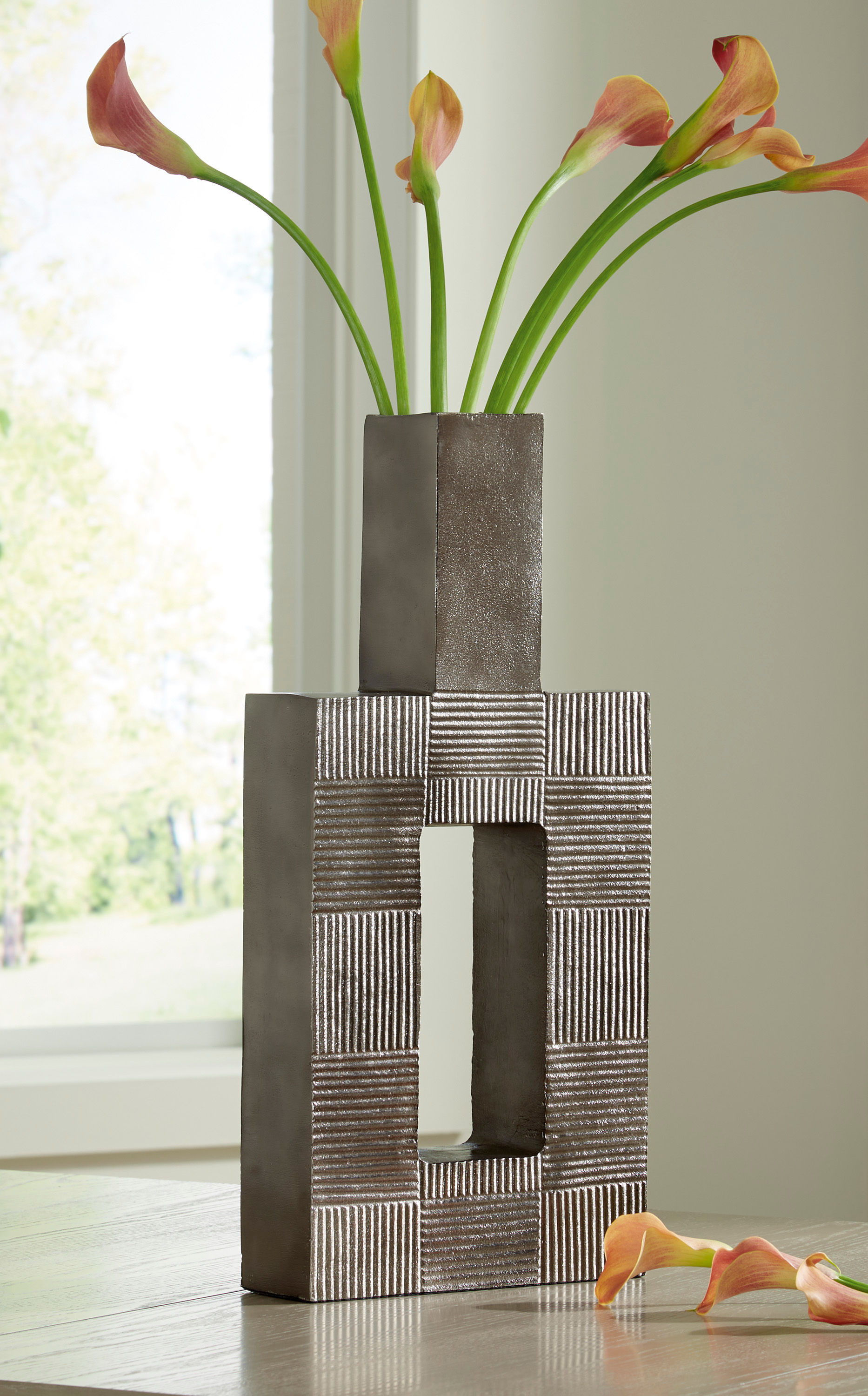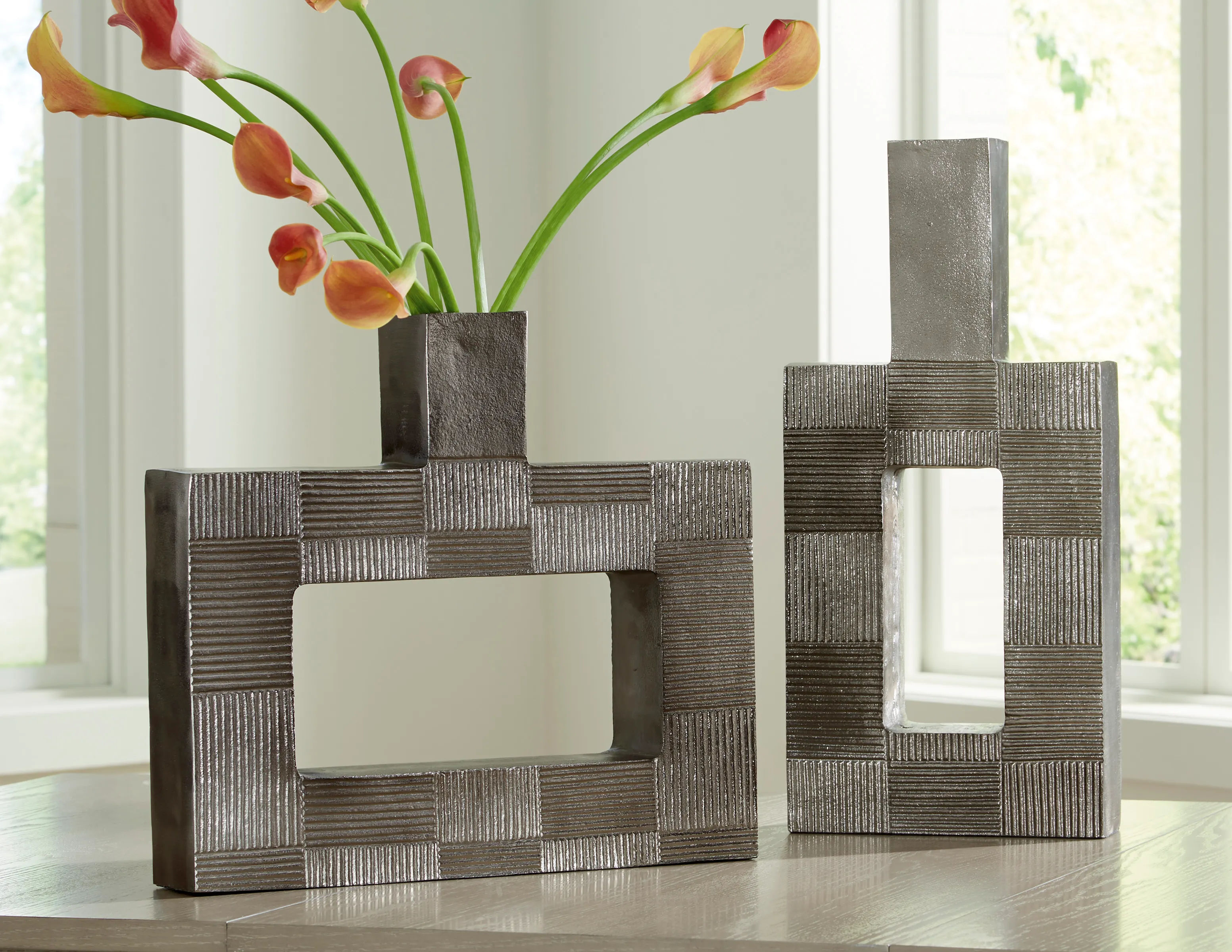 Stunning from all angles, this vase's contemporary geometric form acts as a captivating focal point for your mantle or bookshelf. Its antiqued nickel-tone body is detailed with subtle texture for added visual appeal. What a perfect fit for those seeking forward-thinking style.