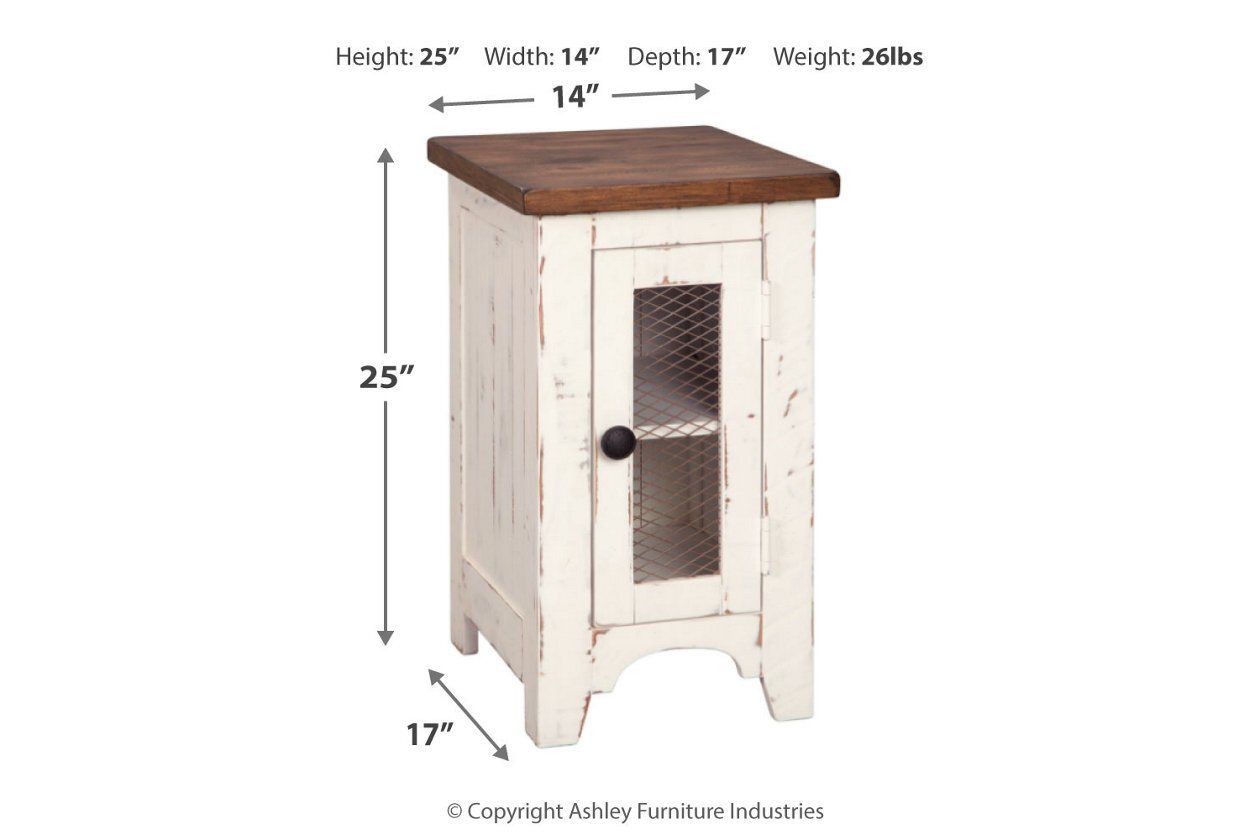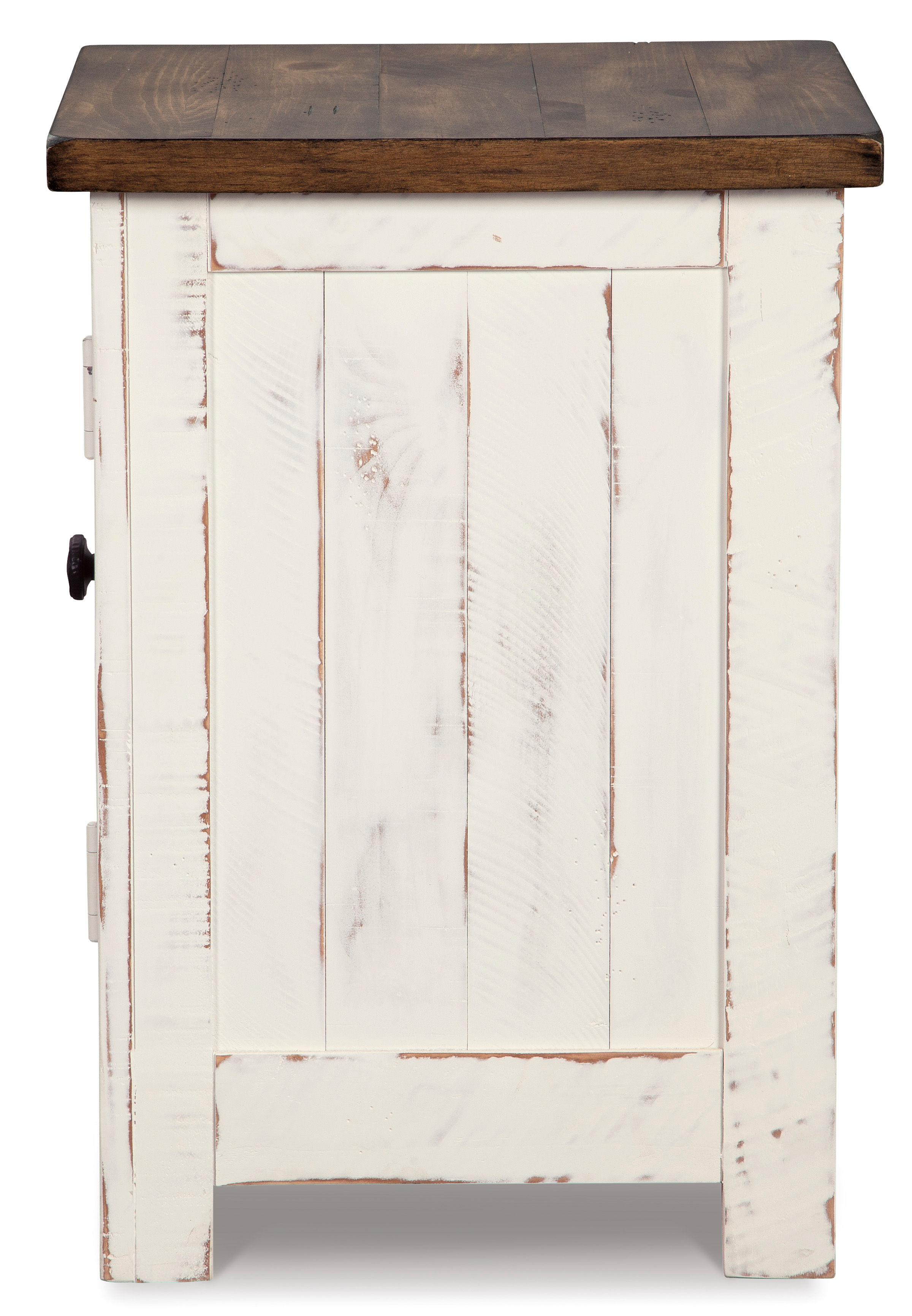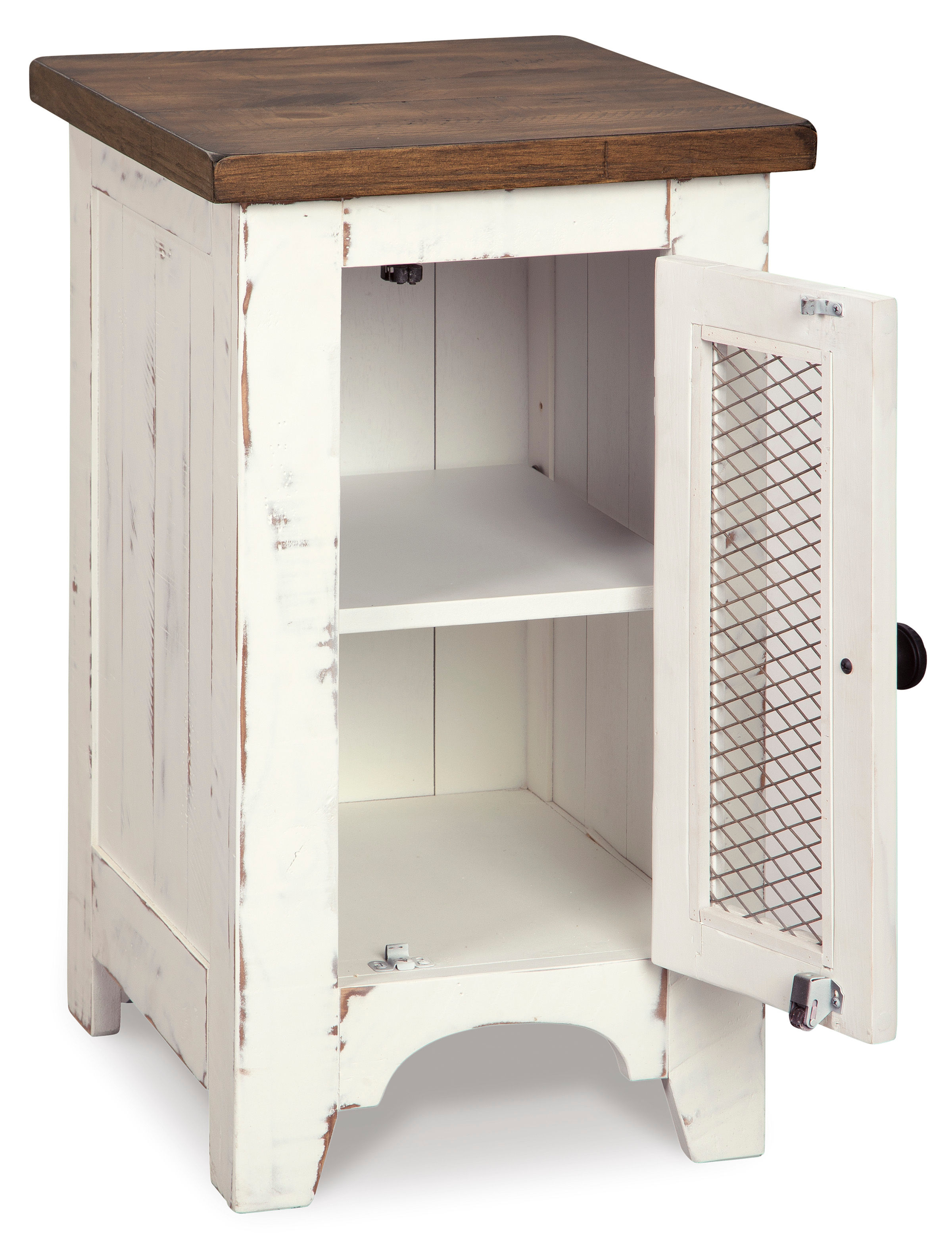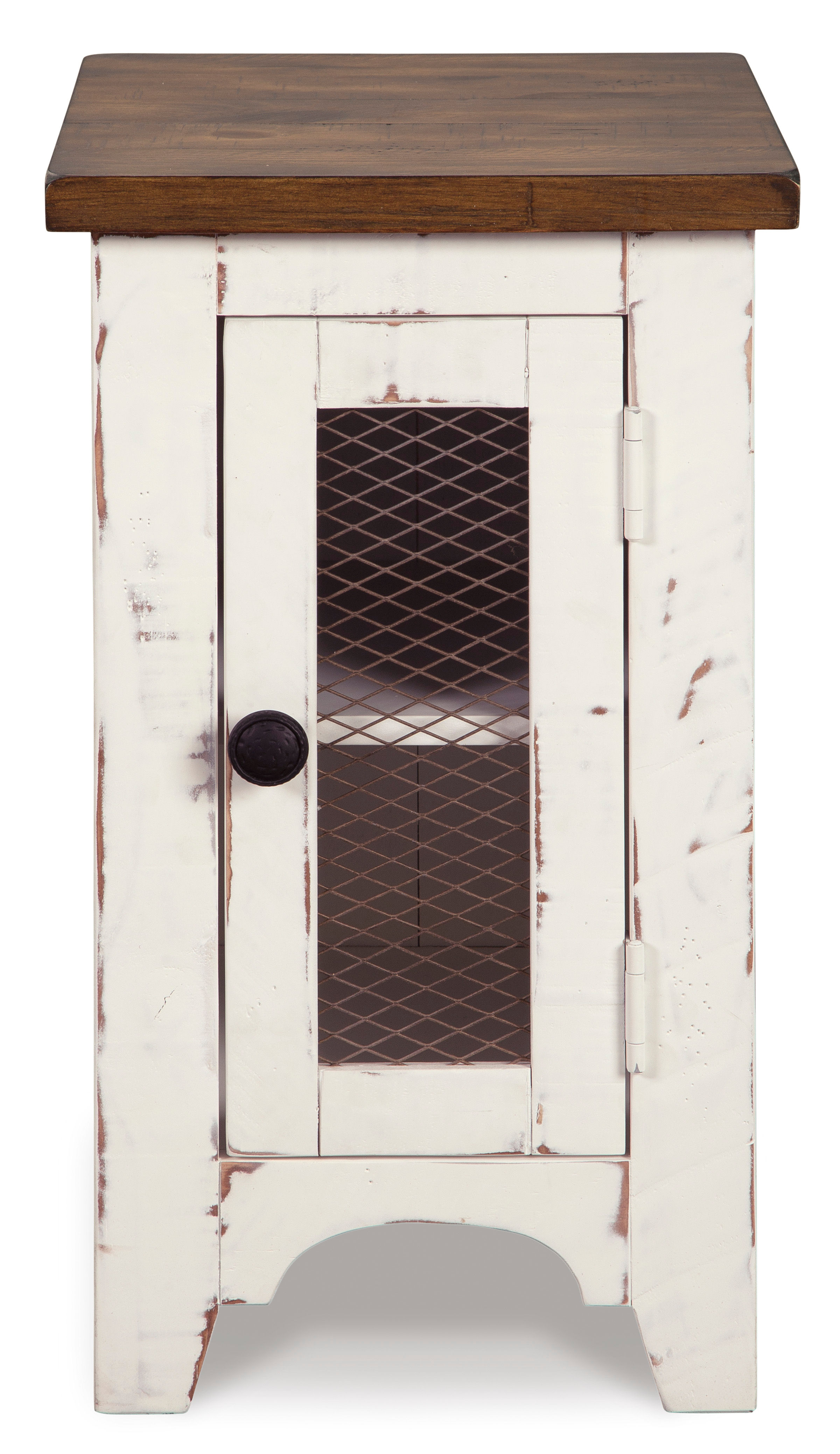 Double take. Sporting a two-tone finish that pairs a distressed vintage white with aged natural pine color, the Wystfield chairside end table elevates the art of rustic farmhouse living. Enhancing its charm: shelved storage visible through the cabinet door with inset metal grill.